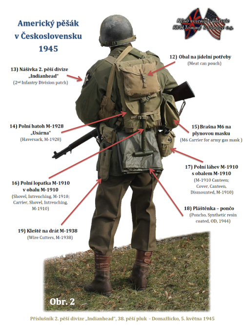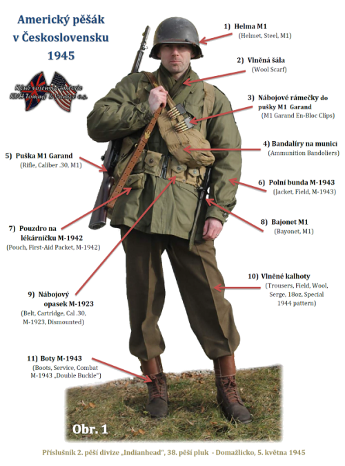 V každé armádě světa je její hlavní hybnou silou a páteří pěchota potažmo její vojáci. Jinak tomu nebylo ani ve 2. světové válce v Armádě Spojených států amerických, která prodělala během tohoto konfliktu jednu z největších proměn své historie. Z nepočetné nepříliš dobře vybavené armády se během války stala největší a nejlépe vyzbrojená vojenská síla ve světě, která významnou měrou přispěla ke konečné porážce nacistického Německa, ale především pak Japonského císařství. Níže vyobrazený příslušník americké armády náleží do stavu 2. pěší divize – „Indianhead“, která prošla napříč Evropou od břehů francouzské Normandie, belgickými Ardenami, Německem, aby v květnu 1945 zakončila svoji pouť právě při osvobozování Československa. Tento voják je názorným příkladem toho, jak během války probíhala změna a vývoj jednotlivých výstrojních součástí a uniforem, neboť je vystrojen a oděn do směsice starších a novějších modelů. Tento jev je zejména typický pro déle sloužící jednotky v rámci operačního prostoru ETO (European Theater of Operations) a nevyhnul se ani 2. pěší divizi, jejíž příslušníci v květnu 1945 často vypadali jako vyobrazený jedinec (). To bylo zapříčiněno především z toho důvodu, že nebylo v logistických možnostech během roku 1944 a 1. poloviny roku 1945 zcela armádu přestrojit novými typy výstroje odstínu Olive Drab no. 7 a uniformami vzoru M-1943. Ty sice byly autorizovány do výstrojního katalogu armády v letech 1943-44, ale i nadále bylo prakticky používáno to, co bylo momentálně dostupné na skladech.